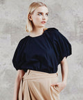 バッグが大きなリボンになった半袖トップス。シンプルながらもクールなブラックカラーと絞りを効かせたデザインが、モードな表情を演出します。 ふんわりとしたボリュームシルエットなのでカジュアルに合わせやすいのも魅力。 二の腕やウエストが自然にカバーされるのもうれしいポイントです。 フレアのスカートとの相性は抜群で、デニムパンツに合わせてもかっこよく決まります。