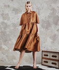 シルクのような上品な光沢感が目を引くワンピース。襟付きできちんと感がありつつも、Aラインが大人かわいい一着です。切り替えを施すことでシルエットに変化が出るのも魅力的。ウエストの位置が高めに設定されいるので、スタイルアップ効果があります。また、二の腕やウエストまわりが自然にカバーされつつ、足元はすっきりきれいに見せることができるのもうれしいポイント。