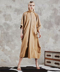 スタンドカラーが知的な表情を演出するワンピース。 ドルマンスリーブのワイドシルエットが特徴的で、清潔感がありながらもラフな印象を与えてくれます。心地よいドレープのあるスリーブは、絶妙な丈感が腕から指先をすっきり美しく演出。体型を自然にカバーしながら、スタイル良く見えるのが魅力です。