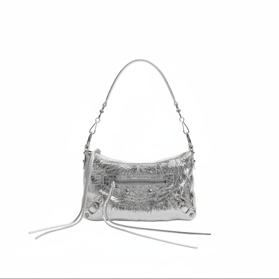 2026年春夏コレクションより登場した「LE CITY MOTO MINI」は、メゾンを象徴する「ル・シティ」のエッセンスを継承しながら、ミニサイズに昇華させた一作。アイコニックなスタッズディテールと、メタライズドアリーナラムスキンの輝きが、コンパクトなシルエットに強い存在感を与えます。
