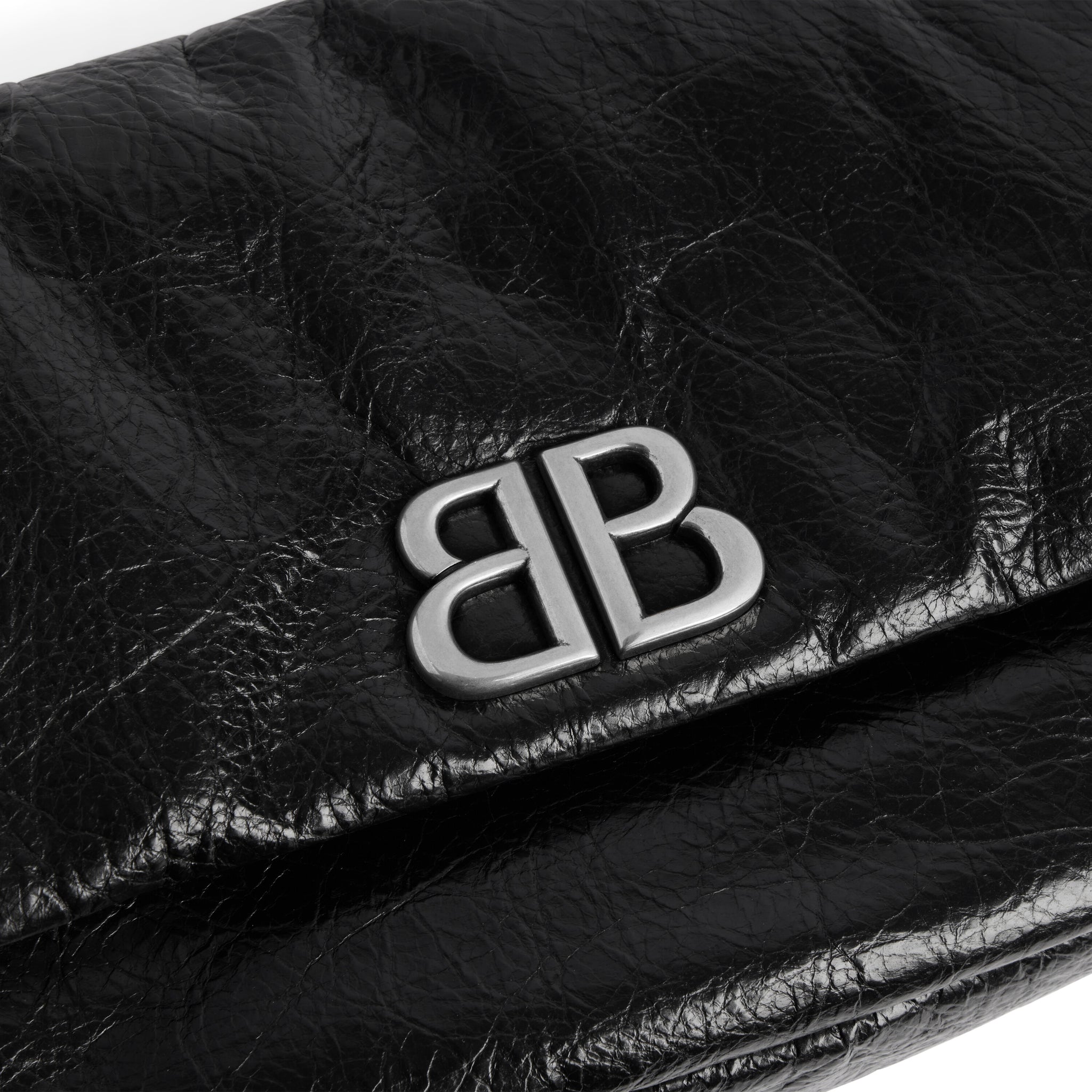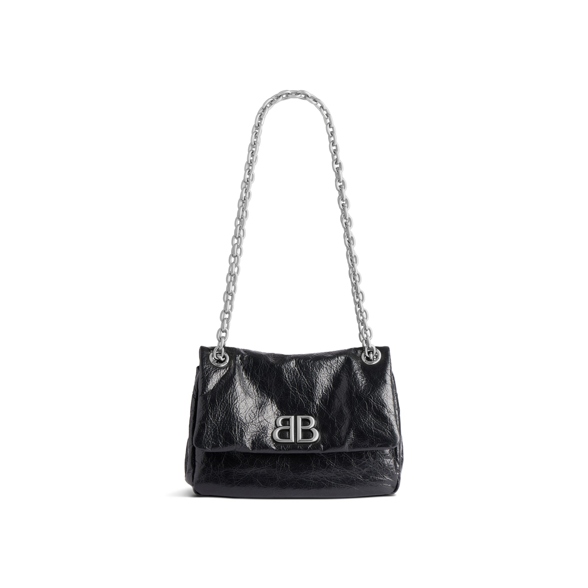 シルバープレートのスライディングチェーンストラップが目を惹くモナコバッグ。前面のマグネットフラップには、立体的なロゴが施されています。